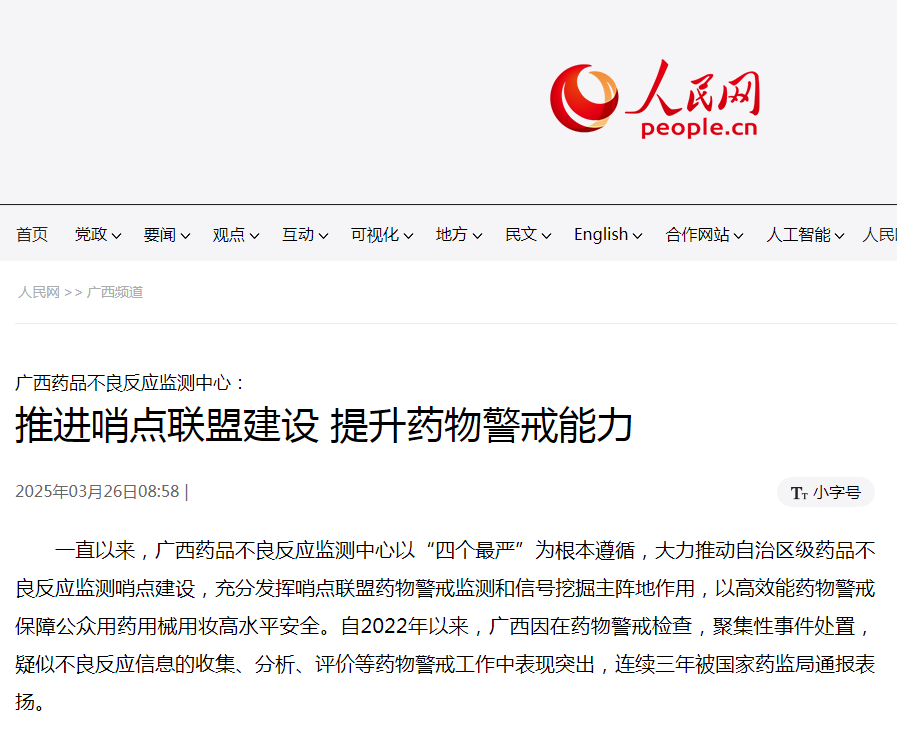一直以来,广西药品不良反应监测中心以“四个最严”为根本遵循,大力推动自治区级药品不良反应监测哨点建设,充分发挥哨点联盟药物警戒监测和信号挖掘主阵地作用,以高效能药物警戒保障公众用药用械用妆高水平安全。自2022年以来,广西因在药物警戒检查,聚集性事件处置,疑似不良反应信息的收集、分析、评价等药物警戒工作中表现突出,连续三年被国家药监局通报表扬。