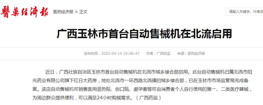 近日,广西壮族自治区玉林市首台自动售械机在北流市城乡结合部启用。此台自动售械机归属北流市阳光药业有限公司旗下红日大药房,地处北流市一环西路北流镇的城乡结合部,已在玉林市成人直播 完成备案。该店自动售械机可销售医用退热贴、创口贴、避孕套等可由消费者个人自行使用的第一、二类医疗器械,为周边群众提供便利,可以满足24小时购械需求。